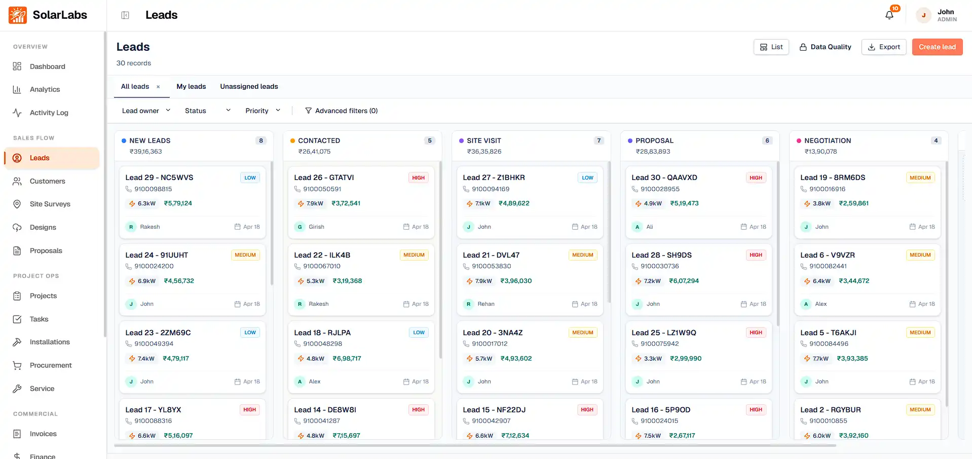 Manage lead management, site surveys, proposal generation, subsidy workflows, installation milestones, invoicing, and service in one solar CRM platform.