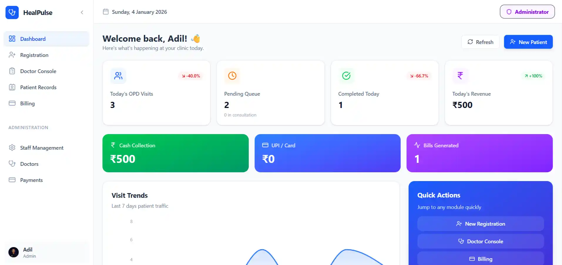 Today's collection breakdown, weekly visit trends, pending billing alerts, and doctor-wise performance tracking — all at your fingertips.