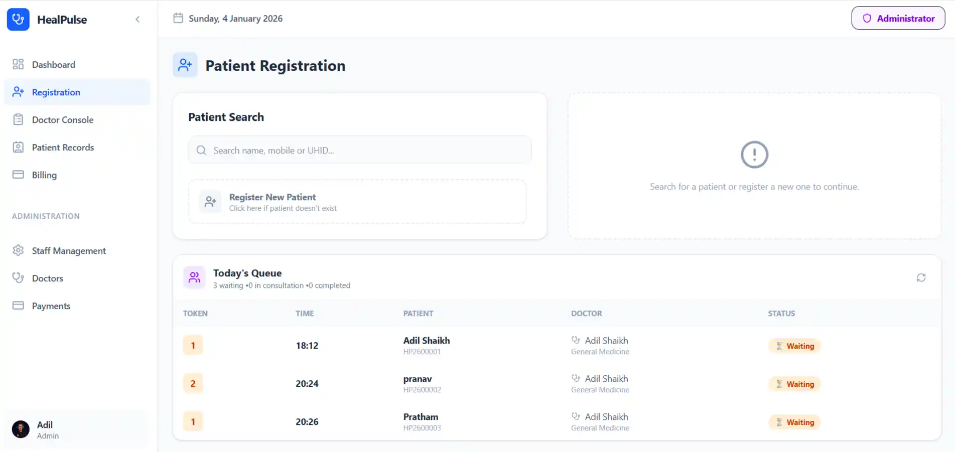 Start registering new patients or import existing data. Each patient gets a unique UHID.